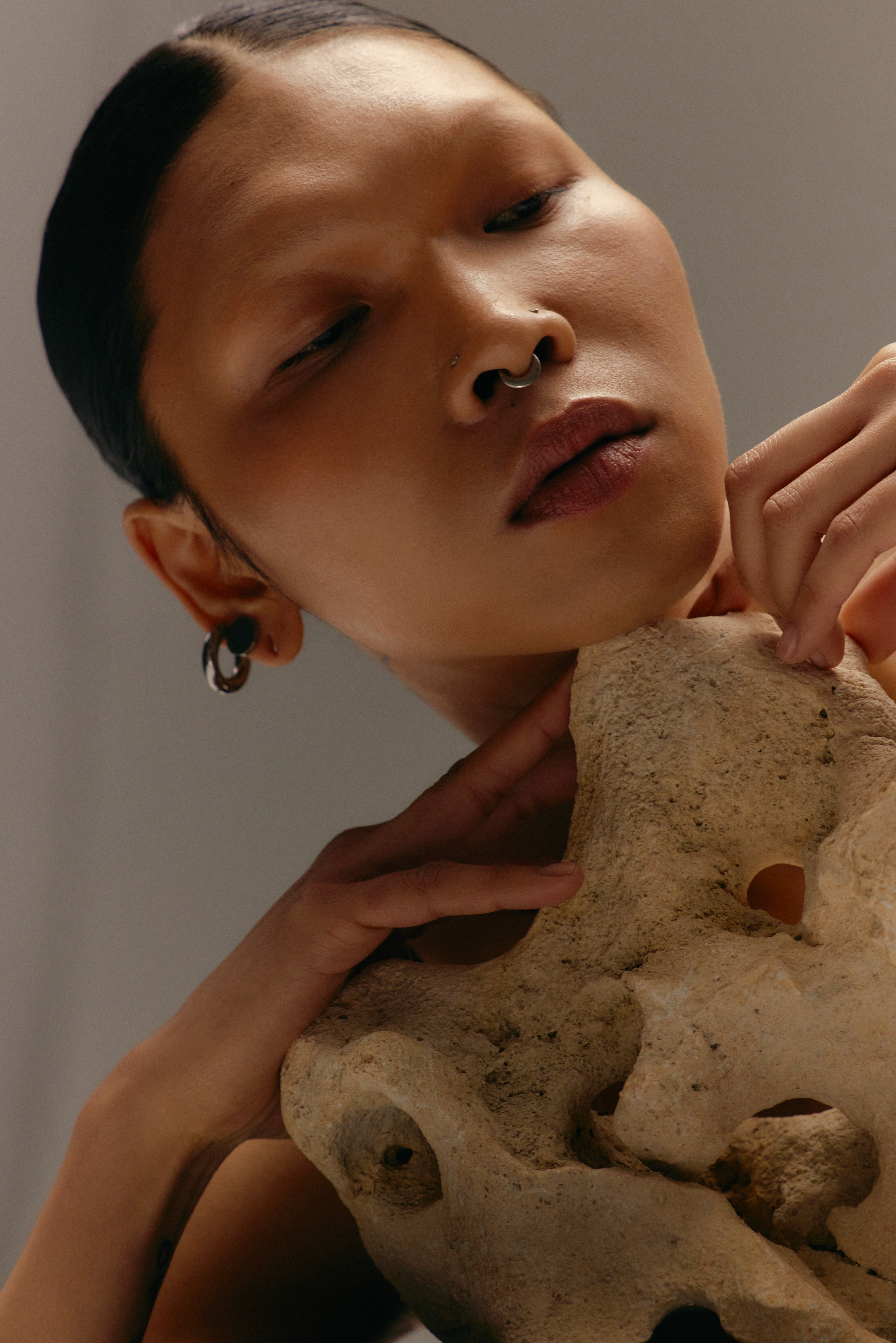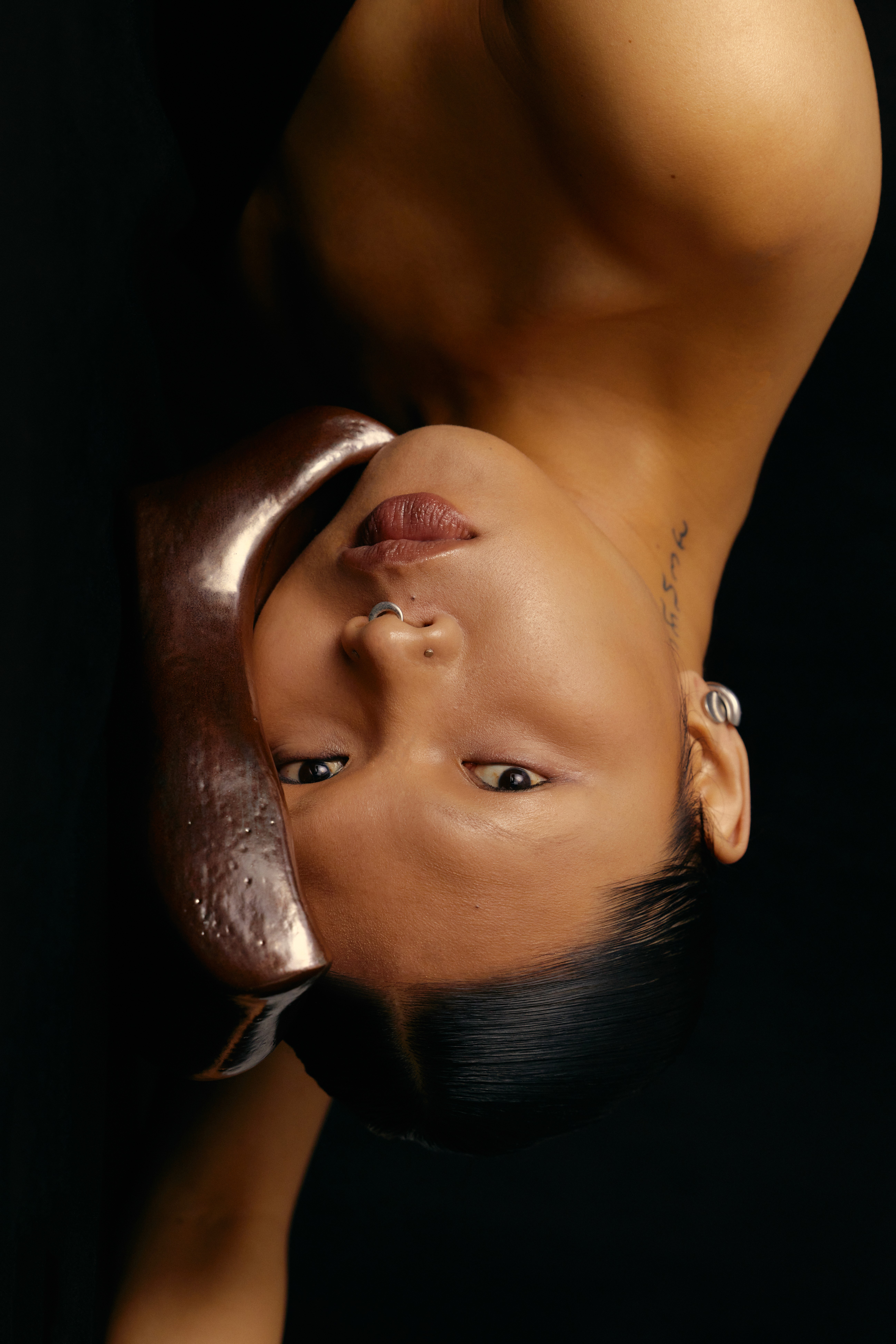 A close crop that challenges identity and representation. The image questions labels, performance, and visibility, using proximity to shift power toward the subject.